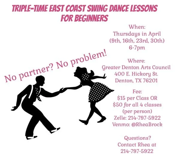 Want to hit the dance floor with new moves and new confidence? Here We Go Dance by Rhea Brock is introducing beginner friendly dance lessons in East Coast Swing! Come join us as we have fun while learning the basics of East Coast Swing including steps, frame, and technique.